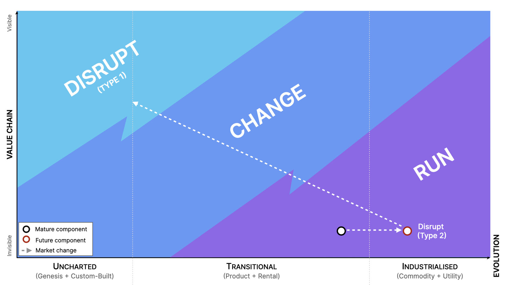 So if you have a Wardley Map of your landscape, see if you can identify where mature, expensive "RUN" is ripe for disruption. If you don't have a map, it's likely the first “RUN” activity you're missing.